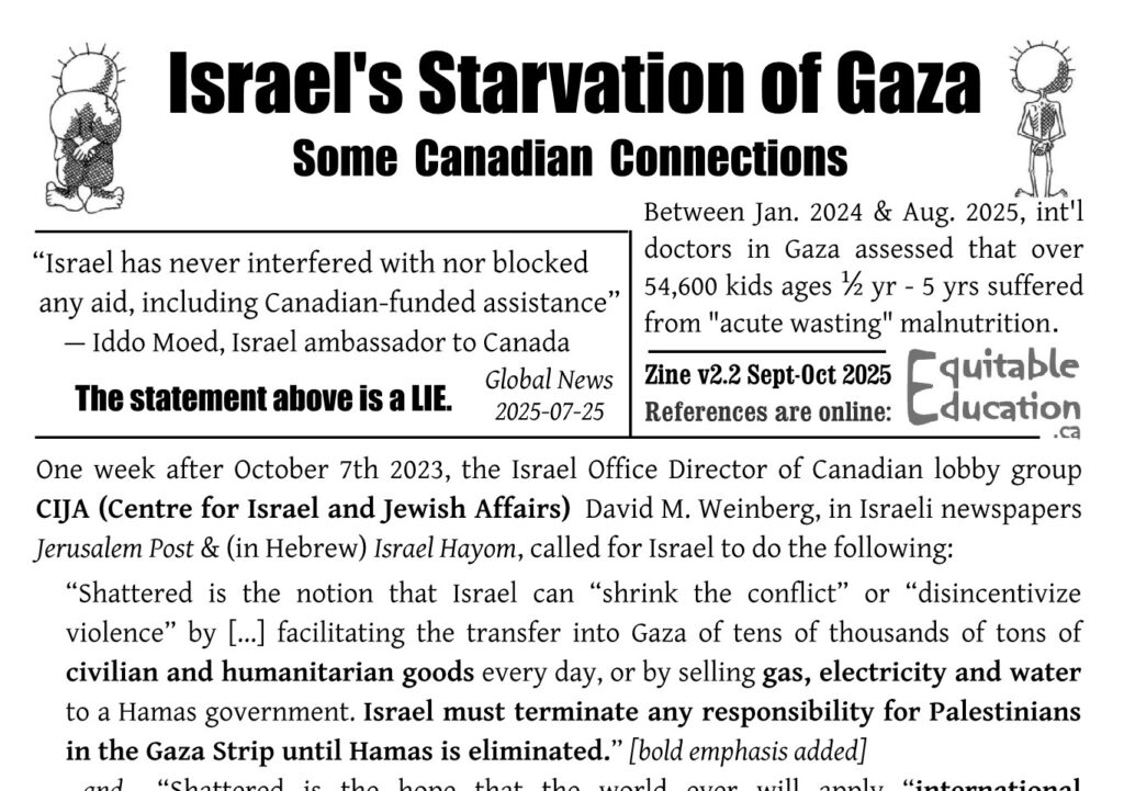 With its long-standing control of Gaza’s borders (as an ‘occupying power’), Israel does have responsibility for the population of Gaza. In the genocide case against Israel, the International Court of Justice ordered six initial “Provisional Measures” 2024-01-26 to protect the people of Gaza from genocide, including for Israel to “take all measures within its power… to prevent… the deprivation of” access to: adequate food and water; humanitarian assistance; and medical supplies and assistance. Israel has violated this and other orders. Weinberg’s words should be investigated to see if they constitute the crime of “counselling” as set out in Canada’s Crimes Against Humanity and War Crimes Act.